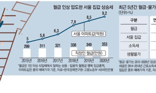 21일 한국경제연구원 발표 자료에 따르면 최근 5년간 근로자 임금총액(1인 이상 사업체에서 일하는 상용·일용직 기준)은 2015년 299만 1000원에서 지난해 352만 7000원으로 17.7% 오르는 데 그쳤다. 반면 서울 아파트 중위 가격은 같은 기간 5억 282만 원에서 9억 2365만 원으로 84%나 뛰어올랐다. 단기간 상승으로는 폭등 수준이다.